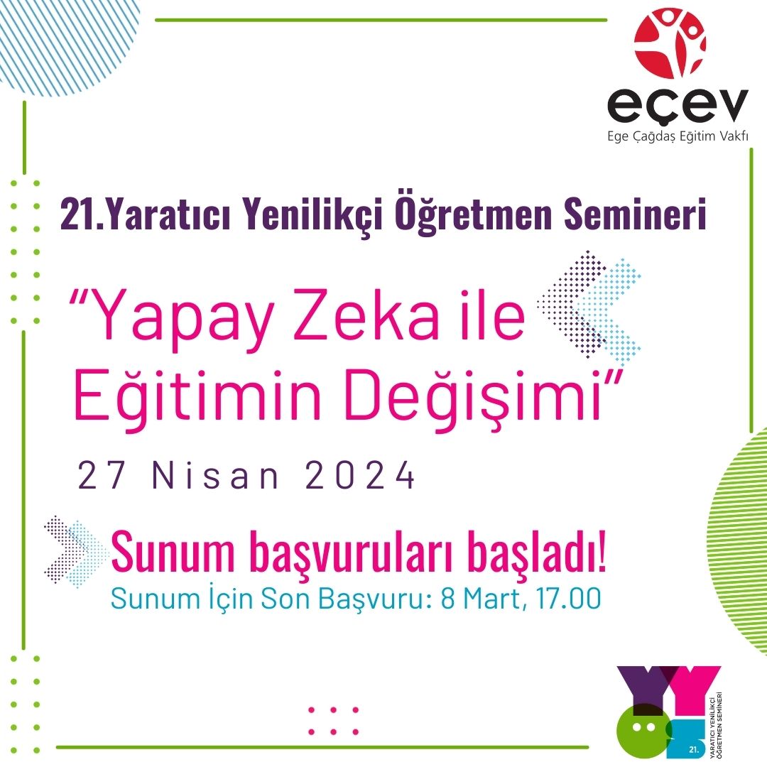 2024 yılında yirmi birinci YYÖS, “Yapay Zeka ile Eğitimin Değişimi” temasıyla 27 Nisan Cumartesi günü gerçekleşerek, eğitim dünyasından değerli konukları ve öğretmenlerimizin sunacağı iyi uygulama örneklerini izleyicilerle buluşturacak.