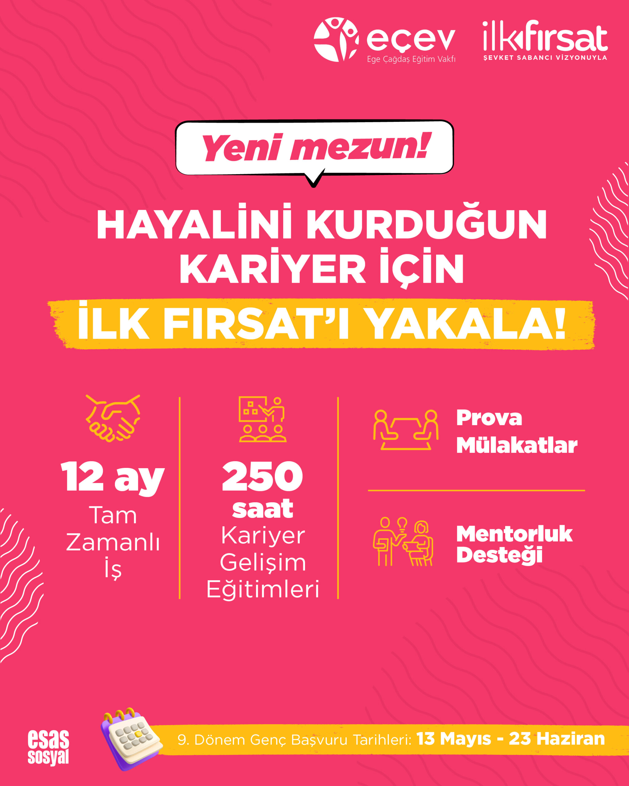Ege Çağdaş Eğitim Vakfı (EÇEV)olarak bizim de paydaşı olduğumuz Şevket Sabancı Vizyonuyla İlk Fırsat Programı’nın 9. Dönemi için genç başvuruları başladı! Program, özelikle işverenlercedaha az tercih edilen devlet üniversitelerinden yeni mezun gençlere, Türkiye’nin önde gelen sivil toplum kuruluşlarında 12 ay boyunca tam zamanlı bir iş deneyimi sunuyor. Katılımcılar ayrıca İlk Fırsat Akademisi kapsamında 250 saatten fazla eğitim ve gelişim desteği almalarının yanı sıra önemli kurumların yöneticilerinden mentorluk ve mülakat becerilerini geliştirecek destekler de alıyor. Başvuruları 23 Haziran 2024’e kadar devam edecek olan Program hakkında detaylı bilgi ve başvuru için